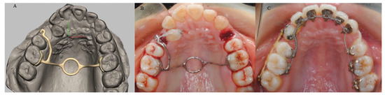 (A) Digital design of a 3D TPA with lateral arm to correct a palatally malposed canine; (B) the 3D TPA with a lateral arm applied intraorally; (C) the malposed canine was corrected with the 3D TPA.
