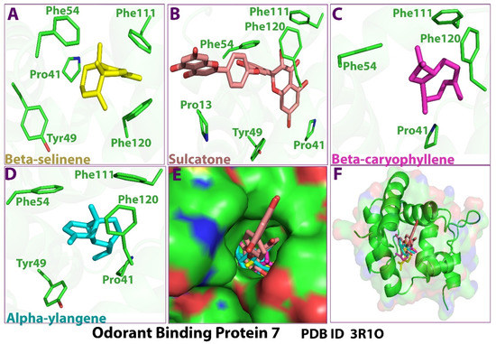 Three-dimensional representation of post-docking interactions of (A) β-Selinene, (B) Sulcatone, (C) β-caryophyllene, (D) α-ylangene (E) all lead phytochemical in the active pocket, and (F) 3D orientation of all lead phytochemical with A. gambiae OBP 7.