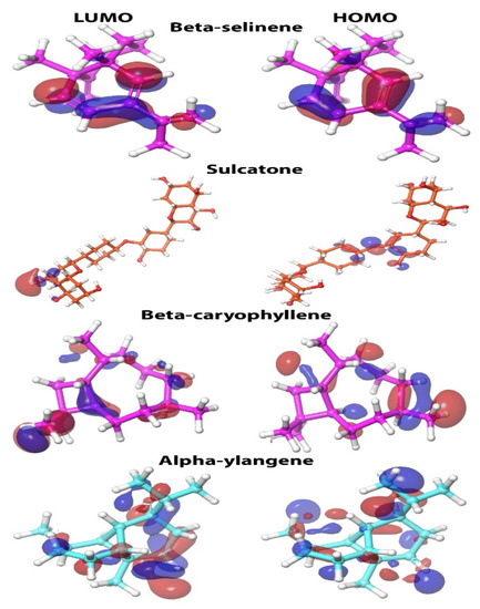 β-selinene had the highest binding energies (−11.1, −11.2, and −12.2 Kcla/mol) to three of the OBPs (OBP 1, OBP 4, and OBP, respectively), thereby exhibiting a multiplicity of binding tendencies. β-selinene, in part or in association with the four lead phytochemicals, may be involved in the functional blocking of the olfactory receptor co-receptors, which underlines the activities reported. The four lead phytocompounds from the docking studies were selected for further computational investigation.
