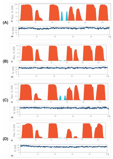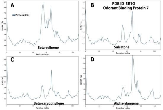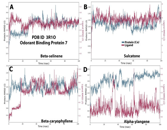 The protein RMSD was equilibrated before the first 10 ns, while the ligand RMSD was equilibrated after the first 20 ns. Both systems were stabilized with minimal fluctuations and converged at 100 ns. Both the protein and ligand RMSD for the sulcatone complexed system were equilibrated before 10 ns of the simulation with minimal fluctuation (less than 2 Å) after equilibration. The protein RMSD of the β-caryophellene bound system was equilibrated after 20 ns with a sharp peak after equilibration, while the ligand RMSD was equilibrated at the beginning of the simulation. Both systems experienced minimal fluctuations that were within the acceptable range of <3 Å, and convergence was also reached toward 100 ns. The protein RMSD plots for the α-ylangene bound system followed a different pattern from the ligand RMSD. Both systems experienced minimal fluctuations that were within the acceptable range of <3 Å, and convergence was also reached toward 100 ns. The protein RMSD plots for the α-ylangene bound system followed a different pattern from the ligand RMSD. Both systems were equilibrated before 20 ns but experienced several deep and peak fluctuations throughout the simulation. The deviance in the RMSD plots further explains the reduction in the secondary structure elements (alpha-helices and beta-strands) (Figure 5D). The binding of α-ylangene reduced the stability of the protein [53]. In general, the odorant protein complexed with the lead phytochemicals except α-ylangene demonstrated a high degree of structural stability and compactness [54]; hence, the systems can be adapted for other experimental models.