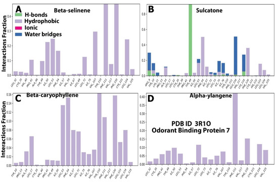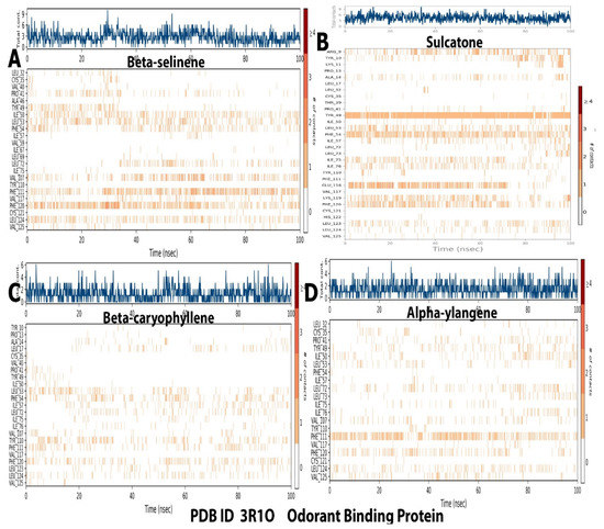A timeline representation of interactions and contacts (H-bonds, hydrophobic ionic, water bridges) between the residues of the odorant-binding protein 7 and the lead phytochemicals (A–D) in the selected trajectory across the MD simulation period of 100 ns.