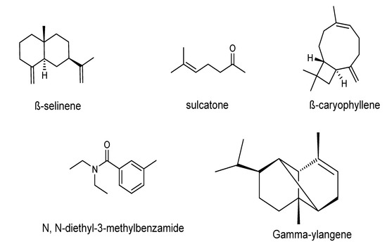In this study, all phytocompounds identified from the GC-MS analysis in the essential oils were retrieved from the PubChem database (www.pubchem.ncbi.nlm.nih.gov) (accessed on 21 March 2022) and saved in the Structure Data Format (SDF). Further, N,N-diethyl-3-methylbenzamide (DEET) (PubChem CID 4284) was selected as a positive control because it is widely used as a chemical repellent against a variety of insects [33,34], strong electrophysiological responses [35], and interference with the olfactory receptor neurons/receptors resulting in avoidance behavior [36].