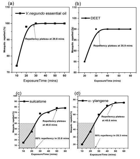 As the exposure time increases, the repellency activity of the compounds increases to a concentration where there are no observable changes in activity. The essential oil showed a significant increase in the percentage of mosquitoes repelled at 49.9 min compared to the compounds; however, no significant difference (p > 0.05) was observed in the percentage of mosquitoes repelled between the pure compounds.