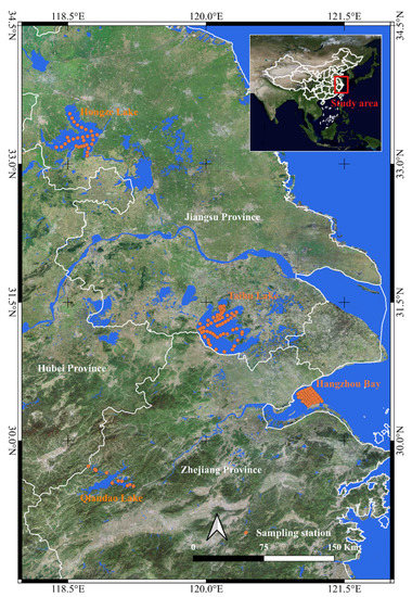 Taihu Lake, located between the Jiangsu and Zhejiang Provinces, is a large shallow lake with an area of ~2338 km2 and a mean depth of ~1.9 m [39]. The lake suffers from water quality deterioration and also shows high turbidity in some areas, due to a large quantity of sediment resuspension. These factors have led to the presence of complex water conditions [40].
