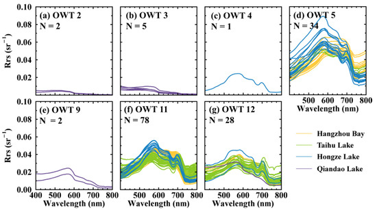 According to Spyrakos’ study [45], the inland water spectra can be categorized into 13 OWTs. They also offered the average spectral of each class. The 150 spectra were clustered in terms of the L2 norm distance to the 13 centers. The results are shown in Figure 2. Most of our samples belong to the OWTs 5, 11, and 12, which are sediment-laden waters, waters high in CDOM with cyanobacteria presence and high absorption efficiency by NAP, and turbid, which are moderately productive waters with cyanobacteria presence, respectively. Only a few samples were clustered into the OWTs 2, 3, 4, and 9, which represents the common-case waters with diverse reflectance shape and marginal dominance of pigments and CDOM over inorganic suspended particles, clear waters, turbid waters with high organic content, and optically neighboring to the OWT2 waters but with higher Rrs at shorter wavelength. From another aspect, we can see that the samples collected in Hangzhou Bay and Hongze Lake are mainly clustered into the OWTs 5 and 11. The samples from Taihu Lake are mainly belong to the OWTs 11 and 12. Nine out of ten samples collected in Qiandao Lake are categorized to the OWTs 2, 3, and 9. Note that in this research, only the Rrs curves between 400 and 800 nm were discussed. This is because the lack of the inherent optical property curves in the wavelength ranges shorter than 400 nm and longer than 800 nm limits the bio-optical simulation.