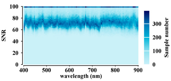 We calculated the SNR histogram of each of the spectral bands (Figure 3). These histograms have two high density regions. The first one is around the SNR and equals 70 for all of the bands. This means that the proposed method can equally represent all of the spectra in the range of 400 to 900 nm. Two SR-processed spectra with a SNR of 77.41 (Figure 4a) and 67.73 (Figure 4b) indicate that such an error level (the SNR is about 70) is negligible visually. The second high density region that appears in the SNR equals 100. In fact, for these samples, the SR and original signals are numerically indistinguishable. The SNR values are infinite. In order to better show the overall characters of the SNR distribution, we set the maximum SNR as 100 in Figure 3. In conclusion, the proposed algorithm can effectively represent the hyperspectral data of the inland water.