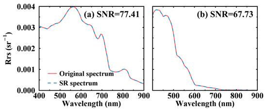 We selected four typical Rrs curves and showed the denoised spectra, together with the original ASD spectra (Figure 7). Different from the simulated noisy spectra (Figure 5), in this dataset, the noises were not evenly distributed along the wavelength. Generally, the spectra curves between 500 and 720 nm are smooth. However, in the shorter and longer wavelength regions, with the decrease in the Rrs signals, the noises were more obvious. The denoised curves are highly consistent with the original spectra. All of the characteristic peaks and valleys were clearly kept after denoising; for example, the Rrs valley caused by the chlorophyll-a absorption peak at around 680 nm and the peak caused by chlorophyll-a fluorescence near 700 nm. At the same time, the Rrs curves at high noise wavelengths became smoother after denoising. The results indicated that, for ASD-measured spectra data, the proposed SR denoising method is also effective. The method is not sensitive to the wavelength distribution of random noise.