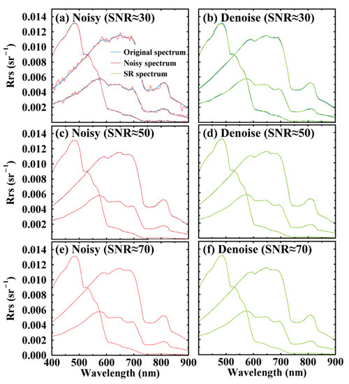 We plotted three typical spectra under varied noise levels, together with the SR denoised ones (Figure 5). When the SNR is around 30, the noisy Rrs curves show obvious vibration (Figure 5a). The sharp peaks and valleys caused by random noise at sensitive bands will bring errors into the water-color estimation models. The denoised signals (Figure 5b) look smooth and highly consistent with the original noiseless Rrs curves. When the SNR was set to about 50, the noised spectra (Figure 5c) were obviously smoother than those in Figure 5a. We could only see some slight fluctuations in several bands. The SR denoised curves were nearly indistinguishable with the original signals. When the SNR is about 70, both the noisy and denoised spectra looked the same with the original Rrs curves. This means that the SR method can yield satisfactory results under both high, median, and low noise levels.