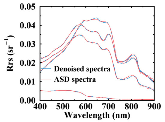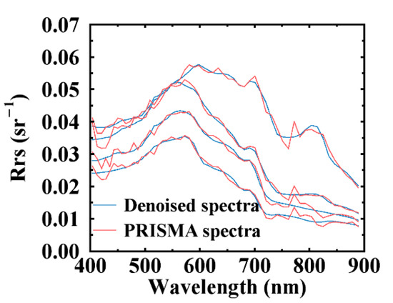 Compared with the remote-sensing image retrieved Rrs, the field-measured Rrs were less influenced by complex absorption and the scattering of gas molecular and particulates in the atmosphere. In addition, the field measurement of Rrs had a longer integration time. This will further decrease random errors. So, the field measured spectra are usually treated as the reference data in research, such as atmospheric correction [49,50,51,52]. However, the field-measured signal is not noise-free. Random factors, such as wind speed, white cap, and platform swing, will all influence the measurement. Some of the related research completed a pre-process to denoise the Rrs curves and then built Cchla estimation models. The improved estimation accuracy indicated the necessity of denoising, even for field-measured Rrs [18,53].