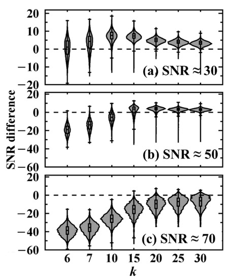 The violin plot of the SNR differences under three input SNR levels is shown in Figure 9. With the increase in k, the denoising performance under different SNR levels exhibited similar trends. When k was less than 10, the SNR differences increased synchronously with k. After k was larger than 10, the SNR differences became flat. This suggests that the SR method is not stable under low sparsity conditions. Another evidence of the stability is the width of the violins in Figure 9a,b. A narrower and longer violin indicates a wider SNR difference distribution. A stable denoising of one dataset is expected to yield a concentrated performance. From this aspect, when effective denoising is generated (Figure 9a,b), a higher sparsity means the model is more stable.