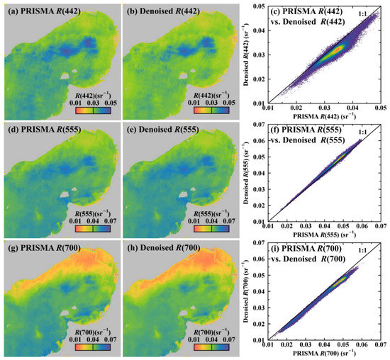 For each spectral band, the denoising process kept the general Rrs spatial distribution of the original image. This further revealed the fidelity of the SR algorithm. In the three bands of the PRISMA image, the R(442) image showed an obvious salt-and-pepper noise. Together with Figure 8, we can infer that the low SNR level of this band caused this error. In other words, the noise that distributed in the spatial and spectral domains are related. Therefore, the denoised image of band 442 (Figure 10b) successfully erased the random errors. For the other two spectral bands, their images look smooth and clear. This means these two bands are at higher SNR levels. The denoising kept most of the original information and slightly changed the reflectance value (Figure 10f,i). The encouraging image validation result suggests that the 1-D SR denoising method effectively improved the quality of the PRISMA image.
