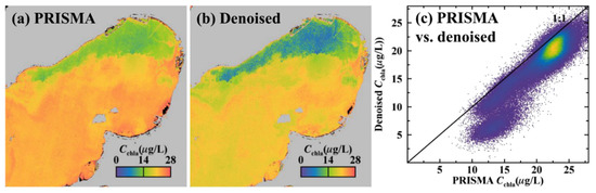 Cchla maps yielded from (a) PRISMA and (b) denoised images and (c) their scatter plot.
