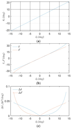 Taking the process of left steering as an example, compared with when the vehicle is not tilting, the influence of the tilting angle on the steering angles is that which is shown in Figure 5. Δδ and Δδ′ represent the errors due to the tilting angle.