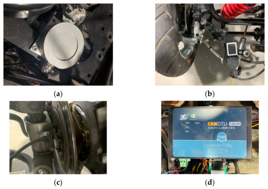 The equipment of the experiment. (a) Inertial measurement unit; (b) angle sensor; (c) wheel speed sensor; (d) data logger.
