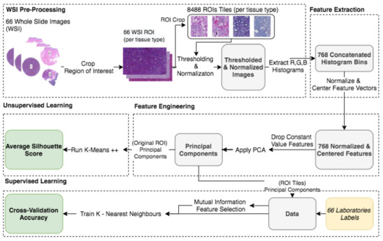 In contrast, the supervised approach showed good separability between laboratories. This result showed that laboratories have an effect, part of which can be predicted. We demonstrated that the tissue type affected the supervised results and cluster assignment. The large accuracy differences between tissue types were shown in the supervised approach. The same effect was shown in the unsupervised results where the rand index showed that laboratory assignment within clusters and between tissue types did not match, i.e., were slightly above the 50% chance level. It is important to note that we simultaneously analyzed the hematoxylin and eosin components in both machine learning approaches. Individual variation may exist in the two staining components whose impact and contribution to these results are yet undetermined. It therefore remains unclear if this effect would persist if the clustering and learning were to occur separately for hematoxylin and eosin.