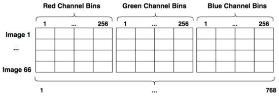When extracting red, blue, and green distributions, histograms quantize all pixel values between 256 bins representing the intensity spectrum for each color channel. We had to further account for the unequal number of pixels and normalized intensity ranges since in the previous step, we applied a mask and normalized by the average intensity (in the inverse of that mask) for each channel and per image. We thus extracted the minimum and maximum intensity found in each channel from all images. After masking and normalization, we used these two values to define the range of values for histogram extraction. The resulting minimum was 0, and the maximum was 1.4704298. After each histogram was extracted, each bin in each channel was normalized by the count of pixels (per image) not masked in that channel, meaning non-background pixels. Finally, we concatenated the resulting channels and thus obtained a sequentially concatenated dimensionality of 768; an illustration is shown in Figure 5.