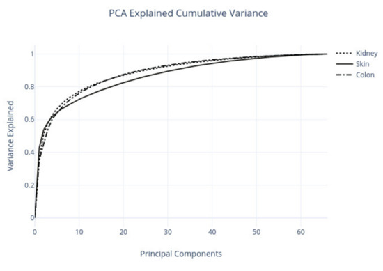 PCA is an orthogonal linear data transformation approach that transforms the input data to a new coordinate system, such that a scalar projection of the data contains the largest variance in the first axis (first principal component). Subsequently, the variance decreases in the other orthogonal axis. PCA was calculated from the covariance matrix of the centralized data matrix using single-value decomposition (SVD). In our experiment, PCA produced a varying number of principal components for each tissue type; we retained 95% of the variance from each tissue type data. The number of PCs for each set was 41 for the kidney, 36 for the skin, and 34 for the colon. PCA reduced the dimensionality size by at least 93% in each tissue type compared to the initial dimensionality. Figure 6 shows the cumulative variance explained by the principal components found for each tissue type set.