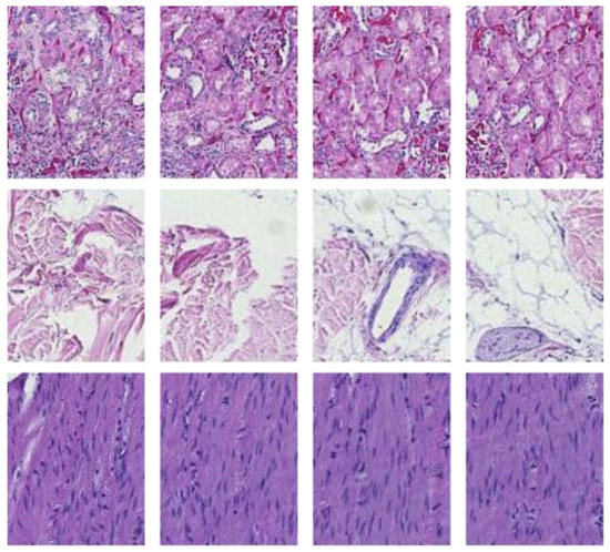 We cropped the original ROIs into 128 image tiles per ROI to conduct supervised learning. The image patches were non-overlapping and 113 × 90 pixels each in size. Consequently, this amounted to 8488 image patches distributed equally amongst 66 laboratories per tissue type. There were 25,462 tiles in total across all laboratories. The ground truth of each patch was the laboratory from which the original ROI was processed. This resulted in 66 ground truth classes, one for each laboratory containing 128 image patches. Examples are shown in Figure 7.