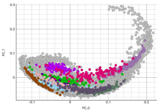 Scatterplot of colon examples along the first two principal components; the highlighted colors show the same random laboratories as in Figure 4, and names are not shown directly due to visual occlusion.
