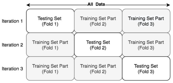 We employed the K-fold cross-validation (KFCV) [39] approach for classifier validation with K = 5. We tracked classification accuracy across the 5 KFCV iterations. KFCV is a data partition method developed for validating supervised models and reducing overfitting. In practice, the entire set of data is partitioned into K folds, one assigned as a testing set and the remaining folds combined into a training set. The method iterates K times, assigning different folds for training and testing each time. Figure 9 showcases the set-up for K = 3-fold cross-validation.