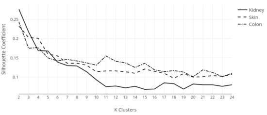 Figure 10 shows the results for the k-means cluster selection: kidney silhouette scores were maximal at with a score of ; the average score across all runs was , with minimum, ; similar scores are found in skin tissue, with top silhouette score at and average score across all K, with minimum . For colon tissues, the maximal silhouette score was at , where we observed the average of across all K and minimum . Overall, we observed a clear descending trend for all tissue types as the number of searched clusters increased. According to Table 2, we saw that scores fall in the same category for skin and colon data , which highlighted scant evidence of cluster formation, while kidney data were , indicating some evidence of cluster formation.