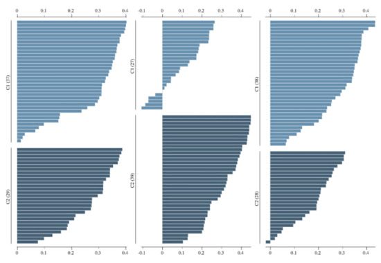 Figure 12 shows individual silhouette scores per laboratory for kidney samples for the first found cluster (C1). The figure is sorted in descending order for the silhouette score. We can see that the first five laboratories with the highest score are 420, 34080, 34082, 1811, and 30,054 with respective scores of , , , , and . The scores are similar, with the average score being , a standard deviation of and a range of where the minimum score is .