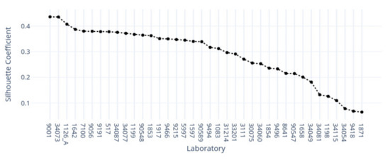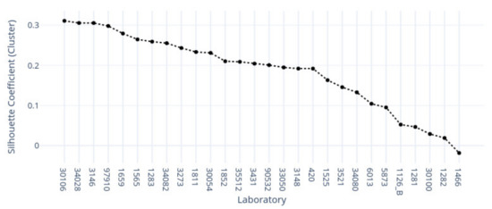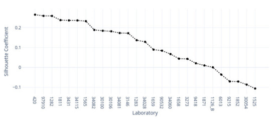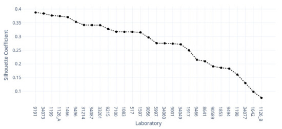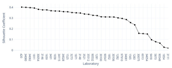 In Figure 17, we show the second cluster allocations of each laboratory across silhouetted scores, sorted in descending order. In the top five positions, we found the following laboratories: 30106, 34028, 3146, 97910, and 1659, with corresponding scores of . The average score was with a standard deviation of and a range of ; the minimum value was −, and only the last sample had a negative score.