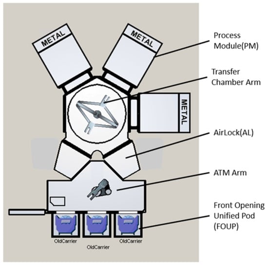 The cluster facility is a single wafer processing automation system widely used in semiconductor wafer processes. It is used not only for the etch facility, which is the research topic of this paper, but also for the deposition and exposure tools []. It comprises one cluster or several process modules (PM), and wafer processes can be executed in parallel. Figure 1 shows a cluster facility consisting of three process modules, two airlocks, a transfer robot with two arms, and three FOUPs [].