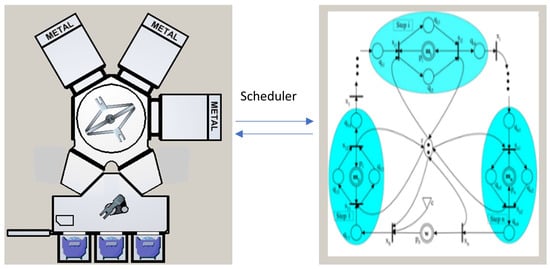 - Sun, T.H.; Cheng, C.W.; Fu, L.C. A Petri net based approach to modeling and scheduling for an FMS and a case study. IEEE Trans. Ind. Electron. 1994, 41, 593–601. [Google Scholar]