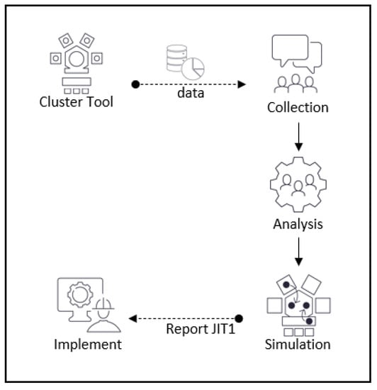 Figure 4 shows that the following steps should be followed to optimize JIT1 for the current cluster facility. A data collection process is required for data analysis, but the data has to be processed due to security concerns in the semiconductor manufacturing fab. It takes significant time to analyze and simulate the processed data []. Manual simulation implementation can be inefficient because it takes a similar amount of time as the primary setting of the cluster facility. In addition, application through simulation is also conducted passively, so the above analysis method is a continuous inefficient work method under the multi-variety production system.