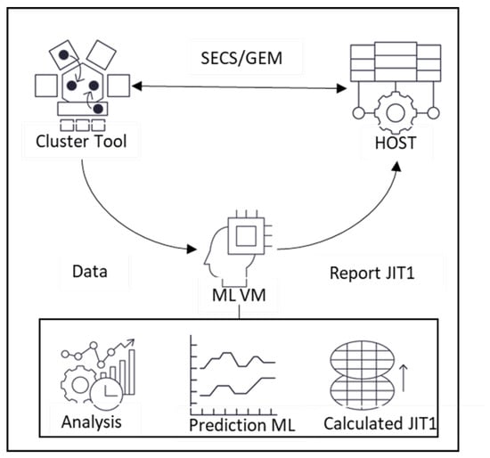 Studies on data analysis and prediction methods using ML VM, as shown in Figure 5, are already in progress in various fields. However, this paper studied an efficient method of using ML systems in a semi-standard environment. This study confirmed the possibility of real-time data analysis and productivity improvement. Throughput data generated by a cluster tool is transfer to the VM and analyzed using ML. As a result of analysis and prediction using ML, the optimal JIT1 value is reported to the host, and the host commands a change in the JIT1 parameter of the cluster tool when producing the following production lot. This is a way to maximize productivity through more efficient work by presenting cases in which optimal parameters can be predicted and applied through data analysis using ML-based algorithms in the fab, considering the characteristics of a semiconductor fab with strict security. The productivity analysis of the cluster includes the data collection and analysis described in Section 3. The analyzed data manually create a test scenario including process time, WAC time, swap time, and JIT1.