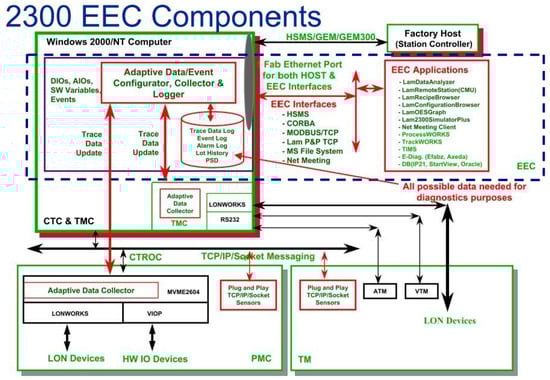 This paper used a simulation of Lam Research to propose a more efficient data analysis method in an environment under an increasingly strengthened security system in the semiconductor industry. Lam Research manufactures various facilities for the semiconductor process, including for deposition, cleaning, and etching. Herein, we aimed to study the productivity optimization method based on mutual communication of SECS/GEM protocol between the etch cluster facility and the fab host based on the actual scenario used in the etch cluster semiconductor production facility. Figure 7 is a schematic diagram of the simulated layout of Lam Research. The simulation of Lam Research made it possible to build an environment similar to the existing facility by simulating all IO and setting values of the existing facility. Based on the experience of actual facility operation, the user can build the communication environment of PMC and TM as well as CTC and TMC internally and externally with the factory host. The CTC acts as central control, collecting and generating data. Through communication between the factory host and CTC, process progress and real-time commands transmitted from the host are executed.