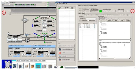 Due to the nature of the semiconductor manufacturing fab, the export of internal data is extremely limited per regulations, such as those regarding data security. Therefore, the study of this paper used a simulation of Lam Research, a semiconductor manufacturing equipment company. The simulation of Lam Research can create an environment similar to the existing facilities by using a variety of changeable parameters. Since each component can set the allowable interval for temperature, pressure, and other parameters, the simulation settings were set similarly to the environment of the facilities in the semiconductor fab. It can be said that it is functional, as shown in Figure 7, and it was possible to change the DIOs, AIOs, and characteristics according to the SW version of the facility. In addition, it was possible to change not only the process time and WAC time of the wafer process but also the transfer time of the ATM robot and VTM robot and the pump/vent time of the airlock. Therefore, it was possible to reproduce the performance of the existing facility by setting it similarly to the environment of the etch cluster facility in the semiconductor manufacturing fab. Additionally, the SECS/GEM communication environment between host and cluster equipment can be simulated. This simulation scenario can be applied to various settings of process time and WAC time by predicting the optimal JIT1 according to process time and WAC time using the ML-based KNN algorithm suggested in the previous study and applying it to the real-time etch cluster facility. This simulation environment provides a highly reliable test environment in which the throughput result is kept constant if no parameter changes. Therefore, the optimal JIT1 value is determined according to the throughput result. Various commands of factory host can be executed, and it is possible not only to collect/transmit real-time data but also to check and verify recipes.