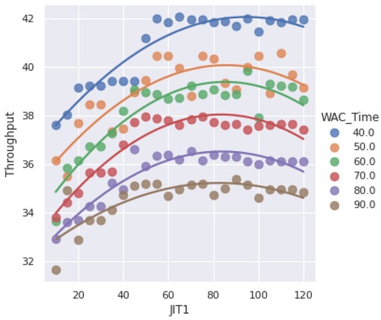 As can be seen from the relationship between JIT1 and throughput in column 4 and row 3 in Figure 3, a significant correlation could not be observed between throughput and JIT1. However, as shown in Figure 9, it was confirmed that the throughput showed a significant correlation with JIT1 when the processing time was fixed at 180 and the WAC and other parameters of JIT1 were changed. In Figure 9, it can be seen that the throughput had an S curve, but the point at which the throughput was stabilized differed depending on the WAC time and JIT1. Therefore, it can be seen that for optimizing the cluster, it is necessary to set the optimal JIT1 considering the processing time and WAC time. There are several ways to find the optimal JIT1 under the variable environment of process time and WAC time. We can determine whether the cluster facility operates efficiently through Equation (1). If the cluster facility’s throughput is smaller than the calculation result of Figure 9, the facility is operating at a non-rate.