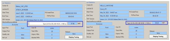 Figure 10 is the result of working to achieve maximum productivity through the methodology presented herein. You can check the error of the target by comparing it with the engineer’s manual analysis and result derivation process. Through simulation, you can check the throughput result. The host’s command to change the value of JIT1 to 58 is accepted, and the simulator is shown in Figure 10. The simulation result of Table 3 can be obtained. The value of JIT1, before being modified to 58, was set to 30, and without the modification, it showed a throughput of 37.06. However, by modifying to 58, it showed a throughput of 38.20, and it was confirmed that it would have better productivity than before. The calculated maximum value is an idealized maximum throughput value calculated by Equation (1).