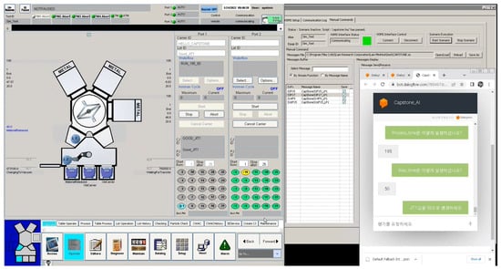 In this section, we propose the utility of JIT1 optimization using ML-based data analysis using the KNN algorithm. When the user inputs process time and WAC time using the chatbot, the optimal JIT1 value is given. Through this chatbot service, the user can know the appropriate JIT1 according to the equipment’s various products, that is, the products of variable process time and WAC time, and can apply it to the equipment. Figure 10 shows the result of improving the productivity of the cluster facility by changing the optimal JIT1 obtained by the user through the KNN ML analysis through the host. The chatbot service is shown on the right side of Figure 11. Implementing the chatbot in the simulation environment can inform users of the optimal JIT1 value according to various process times and WAC times in real time and be an appropriate alternative to the increasingly diversified production environment.