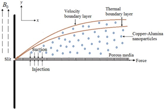 The 2D MHD steady incompressible flow and heat transfer of HNF over a porous medium are here considered. As shown in Figure 1, the transverse magnetic field with strength is applied along the y-axis. In addition, the and nanoparticles are added to the water base fluid. This shows that the velocity boundary layer thickness is more than the thermal boundary layer thickness. The ambient temperature of the HNF is kept constant at . In adopting the standard boundary layer approximation, the leading equations are as follows [],