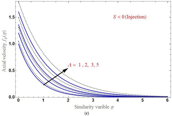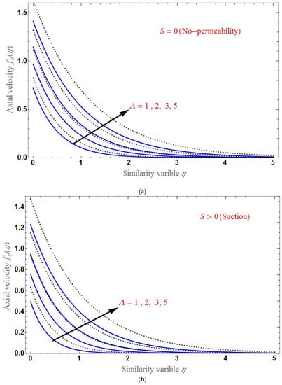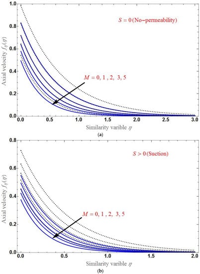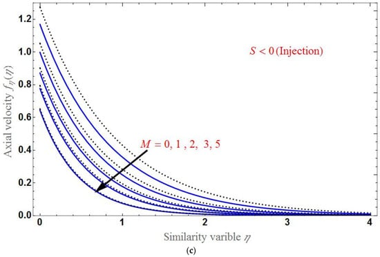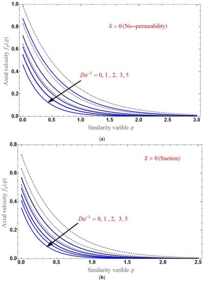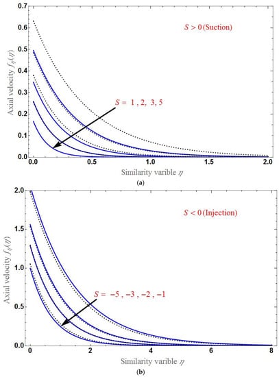 The effect of S is shown in Figure 5 for both the suction and injection cases. Clearly, the velocity profile decreases for a larger . Panel (a) shows that the difference between the axial velocity of the base fluid and the HNF is larger in the case of suction and smaller in the case of injection as in panel (b). At , the axial velocity is different for various values of each parameter.