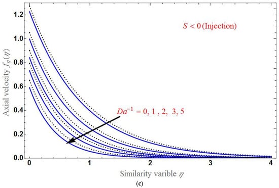 Figure 2 demonstrates the axial velocity for various . We found that the velocity declines as increases. Panels (a)–(c), where the velocity is examined for show that there is no permeability. For suction and injection , we observe that as increases from injection to suction, the axial velocity for HNF very quickly coincides with the base fluid as increases. In all cases, the profile of has a decreasing nature, and it becomes constant to zero at a certain point of .