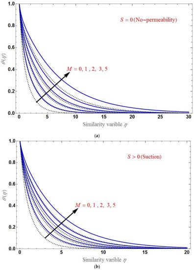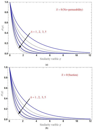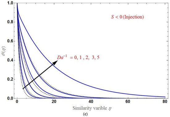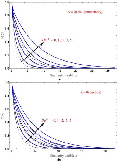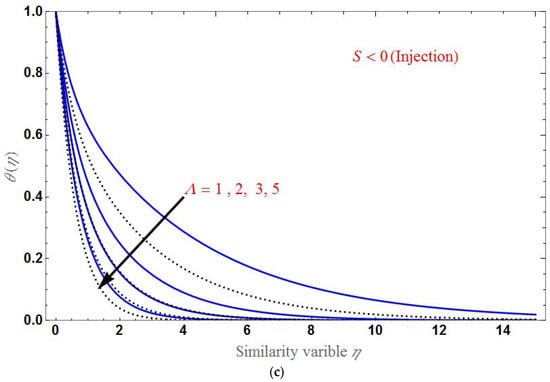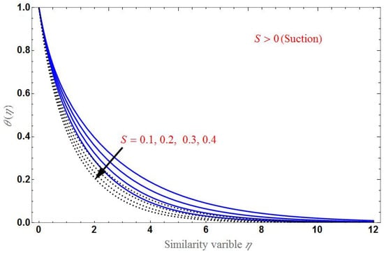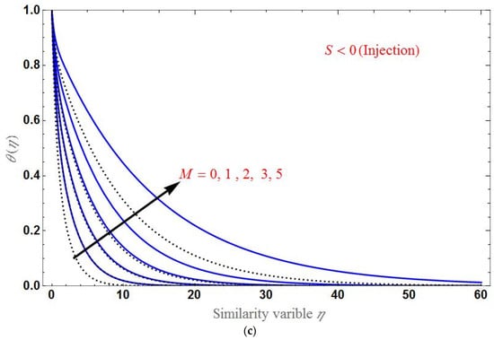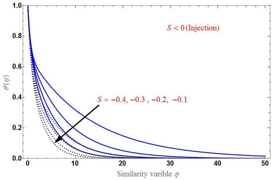 Finally, the effect of various values of on the temperature profile is shown in Figure 10 for suction and injection cases. decreases when as increases, as shown in the figure. The domain of is larger in the case of injection than in suction.