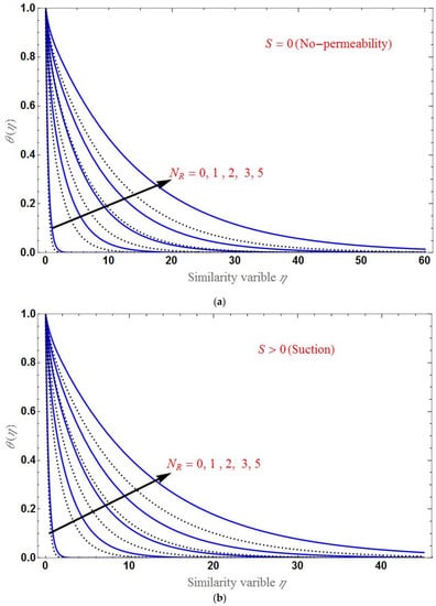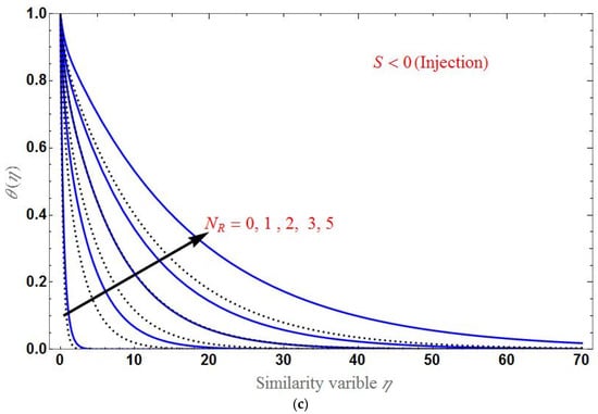 Figure 9 shows the temperature distribution for various values of the radiation parameter . We can observe that increases as the effect of radiation increases. Panels (a)–(c) show the profile for cases with no permeability, with suction and injection. We note that the domain of the temperature is larger in the case of injection and smaller in the case of no-permeability. Furthermore, by observing each plot of temperature distribution, the effect of radiation on the change of heat transfer rate is less than those of the magnetic field and Casson fluid, i.e., the difference in temperature distribution between base fluid and HNF is not that much more significant.