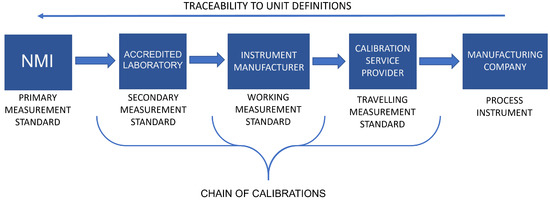 The measurement standards maintained by the NMIs or DIs are referred to as primary standards as their purpose is to provide as accurate and precise physical representations of the unit definitions as possible. Between the industrial applications and primary standards are secondary measurement standards, which are maintained by accredited laboratories and calibrated by the NMIs or DIs. Calibrations are essential to maintain the traceability to SI unit definitions, which ensures the comparability and trustworthiness of measurement results given by individual instruments [8]. Depending on the applications, additional levels of references may also be used in the industry. For example, in the pharmaceutical industry, where the number of instruments used for monitoring and controlling the manufacturing processes can be several thousand per manufacturing site, the use of working standards and travelling standards is common as they provide efficiency in terms of time and costs, e.g., by allowing the calibrations of the process instruments to be carried out on-site. Figure 2 shows an example of a calibration chain from the primary standard of an NMI all the way through to a process instrument of a pharmaceutical manufacturing company.
