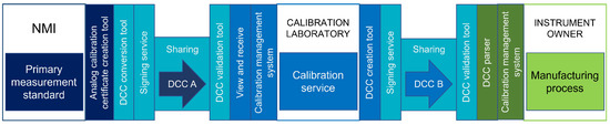 As the digitalization in the industry and other sectors is progressing and the collection and use of data is growing rapidly, the topics concerning data quality and trustworthiness become more and more important, which is driving the research and development efforts in digitalization within the metrology community [7,18]. The ongoing efforts include the definition and development of digital formats for presenting metrological information, e.g., data models for presenting metrologically relevant data as semantic metadata [19,20,21] or formats for digital calibration certificates [15,22,23,24]. For this work, the exchange of DCCs was tested using the DCC format originally defined by PTB and further developed in EMPIR SmartCom and Gemimeg research projects [4,5,25,26,27,28].