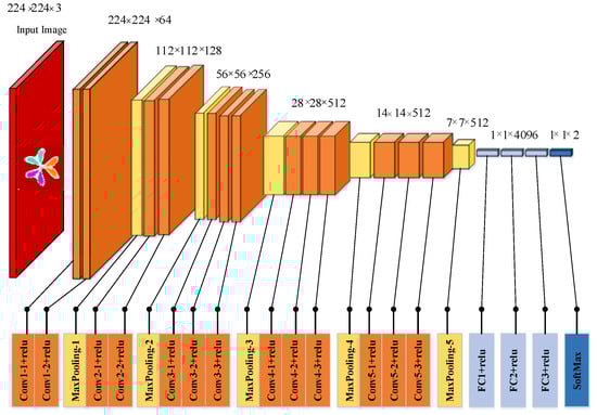 The VGG16 consists of an input layer, a convolutional layer, and a maximum pooling layer with a ReLU activation function, which is one of the CNNs for feature extraction, which finally enters SoftMax in order to achieve the result of the fault classification. Among them, the convolutional layer and the pooling layer are crossed with the filter layer for the feature extraction of the data, respectively. The typical structure of the VGG16 is shown in Figure 2.