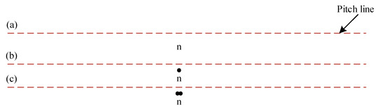 The present study was conducted for the health diagnosis of three different degrees of pitting in the individual gear teeth of an active gear, namely normal, single pitting, and double pitting, where the gear pitting condition usually occurs first on the root surface of the tooth near the pitch line. A schematic diagram of the three types of pitting in the gear is shown in Figure 3.