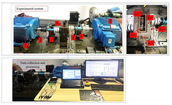 Experimental setup. 1–7: Active motor; 2–5: Coupling; 3–6: Torque speed sensor; 4: Gearbox; 4.1: drive gear; 4.2: driven gear; 4.3, 4.4, and 4.5: Three-direction acceleration sensor.