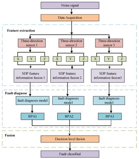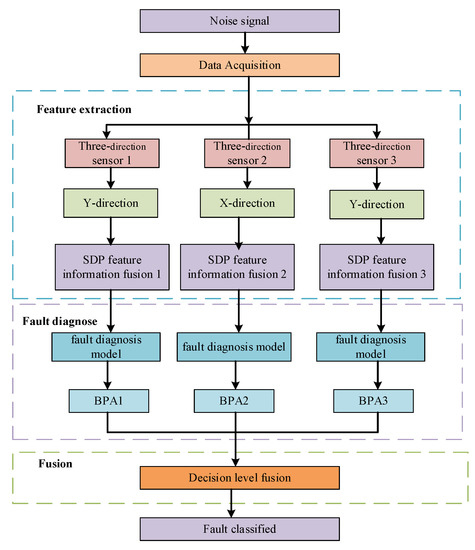 The SDP technique converts the raw signal of the time series into an image, and operators with low expertise can visualize the state of the detection object. The previous detection methods for blades were unable to make a sufficiently rapid response to the onset of a stall and to perceive the method of a stall. Bianchi et al. [22] proposed the application of SDP technology by using sound visualization for early stall-warning detection for the early fault diagnosis of cooling axial fans, in the context of strong noise. Based on the visual patterns, the researchers can detect the failure location, therefore, solving the problem that the conventional methods cannot achieve a perception of the failure state. The rolling bearing vibration signal is a typical non-smooth signal, and the traditional time-frequency analysis technique is difficult to apply. Therefore, Sun et al. [23] used a composite method of the SDP method and Harmattan distance collection in order to diagnose the bearing faults and classification, which converts the incoming vibration signal into an image by using the SDP technique and monitors the health of the object more intuitively than the traditional method. The vibration signal is complex, nonlinear, and nonstationary, but it is a common fault diagnosis signal. Li et al. [24] developed a rolling bearing fault diagnosis method (ASDP–DBSCAN) by combining the adaptive symmetric point pattern junction density-based noise application space clustering. The proposed method can improve the diagnosis accuracy and can solve the problem that occurs when the detection object is in a harsh environment, using the traditional time-domain, in that the frequency-domain and the time-frequency domain fault processing methods may lead to error information and the signal, therefore, needs to be denoised in advance when using the traditional methods for fault diagnosis. However, the SDP technique requires no denoising of the signal when the amplitude that is required is lower than the background noise; in addition, the SDP technique is suitable for making subtle differences in the apparent input signal for easy analysis and is, therefore, more effective than the other techniques. The rotational stall is a common fault in centrifugal fans, and many researchers have proposed rotational stall detection methods, but the detection has been seen to be unintuitive. Xu et al. [25] made use of the SDP technique for fault diagnosis by extracting the pressure signal for detecting the rotational stall from a fan, characterizing the signal in a visual form, which is more effective than the other techniques when the effective signal is relatively low compared to the background noise, laying the foundation for centrifuge stall prevention. Transient shock is the main form of rolling bearing failure, and it is usually disturbed by external noise. Therefore, in order to solve this problem, Sun et al. [26] used the SDP method with empirical modal decomposition after the first five eigenmode functions (IMF) improved the Chebyshev distance for fault diagnosis, which is more accurate than the common fault diagnosis. For transient shock, a common solution is to combine the empirical modal decomposition and the principal. The advantages of the component analysis is the analysis of the bearing faults, but the error of this classification effect is larger. In addition, the SDP technique is used to convert the vibration signal into an image, which saves the parameter adjustment time and avoids information loss. The traditional fault diagnosis methods are difficult to deal with in terms of the nonlinear vibration signals. Therefore, Gu et al. [27] designed an SDP technique with a deep convolutional neural network for a variable condition bearing fault diagnosis algorithm; traditional fault diagnosis methods may lead to undesirable or even wrong results for nonlinear signals, therefore, using the proposed method can not only visualize and diagnose the mechanical equipment faults, but can also improve the fault diagnosis results. Although the SDP algorithm can visualize the health status, the fault generation is not generated by a single direction, but rather by multiple directions. The fault signal cannot be fully captured by mounting the sensor at a fixed location, and the accurate diagnosis of the fault cannot be obtained by the data from a single direction sensor. It is not enough to only collect a single sensor signal and convert it into the SDP image in order to assess the health status, which results in low accuracy and unstable diagnostic results. In order to improve the accuracy of the diagnostic results, this paper adopts a decision-level approach of multi-sensor fusion.