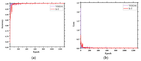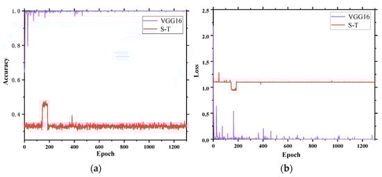 Single-channel VGG16 and S-T models evaluation metrics. (a) Accuracy comparison of VGG16 and S-T; (b) Loss comparison of VGG16 and S-T.