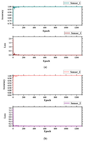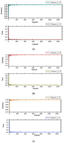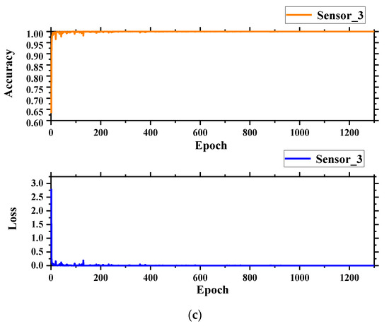 From Figure 12, it can be concluded that the individual sensor models have been basically trained and were stable at 1300 iterations. In Figure 12a, the accuracy was 99.84% with a loss of 0.0058; in Figure 12b, the accuracy was 99.67% with a loss of 0.0015; and in Figure 12c, the accuracy was 99.91% with a loss of 0.0048.