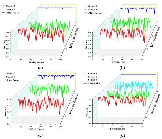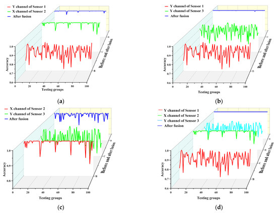 Before and after multi-channel sensor fusion. (a) sensor 1 and sensor 2 fusion; (b) sensor 1 and sensor 3 fusion; (c) sensor 2 and sensor 3 fusion; (d) 3 sensors fusion.
